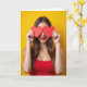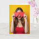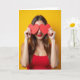 This design shows a woman framed from the upper torso up, holding two red paper hearts over her eyes as if she’s teasing someone she adores 🥰. Her dark hair falls around her face against a smooth, sunny yellow background that makes the reds stand out. Soft, even lighting keeps the scene gentle, with no harsh shadows, and you can still catch the curve of a small smile beneath the hearts. Her glossy red lipstick, red manicure, and red tank top match the paper hearts, tying everything together in a flirty, romantic way ❤️. Any greeting text would sit neatly at the top or bottom in a simple white or black font so it stays readable on the yellow field. The hearts are held close to her face, and her fingers curl around their edges with a careful, affectionate touch. Share Valentine’s Day sentiments with someone special.