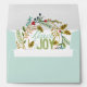 Light blue envelopes with a pretty floral sprig on the outside flap, inside has a branches and berries laurel wreath that reads Peace & Joy.