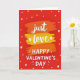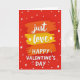 This Valentine's Day card features a deep red background sprinkled with small white dots and tiny heart shapes, like confetti across the page. Near the center, the words “just love” appear in white, written in a flowing, cursive-style lettering. That phrase sits on top of two wide paint-like streaks, one orange and one yellow, which add a warm, sunny contrast to the red. Beneath it, “HAPPY VALENTINE’S DAY” is set in white, in a simple all-caps print style, with short dash marks near “HAPPY” and “DAY” that feel like little rays. A few small white hearts are tucked into the word “love” and scattered around the design, giving it an extra sweet touch 🥰. The overall look feels direct and caring, making it easy to give to a partner or a close friend when you want to say love matters.