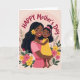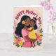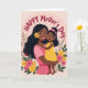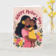 This card shows a smiling woman holding a happy young girl close at the center, their cheeks nearly touching in a tender, affectionate pose ❤️. Both have deep brown skin, flowing dark hair, and bright eyes that meet with an easy closeness, like best friends who feel safe together. The woman wears a soft pink dress with a yellow flower tucked near her ear, and her arms wrap gently around the child’s shoulders. The girl wears a sunny yellow dress and a small pink headband, leaning in as if enjoying a shared joke 🌼. Behind them sits a blush-pink circle that frames the pair like a gentle halo and keeps the focus on their embrace. Along the lower half, stylized flowers in fuchsia and warm yellow mix with green and reddish leaves, curving upward to cradle the scene. Across the top, a curved line of crimson lettering carries the message, standing out clearly against the pale background. The floral border clusters most densely near the bottom center, with petals and leaves fanning outward in a neat arc.