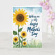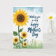 Designed with a sunny floral scene, the illustration features a large golden-yellow bloom in the upper left, its petals shaded with gentle gradients around a deep brown center. Beneath it, several smaller yellow flowers rise on sturdy green stems, with leafy shapes that lean toward one another like close friends sharing a quiet moment ❤️. The background shifts from soft sky blues near the top to muted meadow greens near the bottom, with faint plant silhouettes adding depth without crowding the scene. On the right side, an open white area creates breathing room, as if inviting a loving note to be added. A short greeting is placed in that white space, aligned slightly to the right, in a smooth dark gray or black lettering that stands out clearly. The overall layout feels airy and affectionate, with the flowers angled as if they’re turning toward someone special 🌼. The lower edge shows wispy green foliage layered over a pale green wash, while the upper area remains a light blue sky fade.