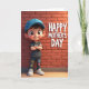 This greeting card features a stylized young boy standing slightly left with his arms crossed, wearing a blue cap, a dark gray shirt, and blue jeans decorated with many small, colorful fabric-like patches. His big eyes, rosy cheeks, and wide smile give him a sweet, affectionate look, as if he’s proudly posing for someone he cares about ❤️. Behind him is a warm reddish-brown brick wall with a textured surface that feels cozy and familiar. On the right side, large white text reads “HAPPY MOTHER’S DAY,” set in all caps and spaced to stand out clearly against the bricks. Soft light falls across the scene from one side, adding gentle shadows that make the wall and his face look more dimensional. A smooth wooden floor at the bottom grounds the setting and adds a homey touch 🌼. The patches on his jeans and shirt show tiny splashes of color like reds, yellows, and greens against the blue denim.