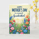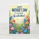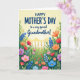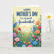 This greeting card opens on a soft yellow-to-green gradient background that feels like early morning light, with “HAPPY MOTHER’S DAY” centered near the top in deep blue, uppercase lettering. Just beneath it, a smaller line reads “to a very special Grandmother!” in a flowing deep-blue style, sitting close enough to the main title to feel like a gentle reply. The lower two-thirds fills with a thick garden of flowers and leaves, where blossoms lean toward one another as if sharing a quiet, affectionate moment ❤️. Petals in fuchsia, lavender, sky blue, coral, and crimson overlap with lively green stems, and many blooms have sunny yellow or orange centers that draw the eye. Slender, spike-like blue flowers rise through the mix, adding height and a friendly, neighborly rhythm to the arrangement 🌼. A white picket fence runs across the mid-ground, partly hidden behind the growth, giving the scene a cozy, welcoming backyard feel. Soft shading around the lettering and some petals adds depth, and the fence’s short vertical slats peek through the foliage in crisp white.
