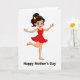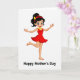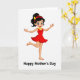 This card shows a youthful woman centered on a plain white background, posed like she’s mid-dance with one leg lifted and her arms open as if welcoming a hug ❤️. Her dark hair is pulled into a high ponytail, held by a red headband topped with a small golden leaf detail that adds a gentle, affectionate touch. She wears a sleeveless red dress with a flared skirt that seems to swing outward, giving the scene an easy, friendly energy. A yellow beaded necklace rests at her neckline, warming the look and echoing the soft blush on her cheeks. Her wide eyes and big smile feel like she’s sharing a sweet moment with someone just outside the frame, like a warm glance between close family or friends 🌼. She stands barefoot, which makes the pose feel relaxed and close-to-home rather than formal. The words “Happy Mother’s Day” sit beneath the figure in dark lettering, centered near the bottom. The red headband and golden leaf accent stand out crisply against the white space.