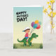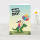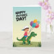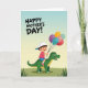 This card shows a cheerful scene of a young boy with rosy cheeks riding on a friendly green, scaled creature across a soft grassy hill, and the two share an easy, trusting look that feels like a sweet bond ❤️. The boy wears a simple cap with a red shirt and blue shorts, sitting upright as if he’s proudly along for the ride. In one hand, he holds a bunch of balloons that float behind him in purple, orange, teal, red, and pale pink, adding a light, celebratory touch. The background fades from pale blue at the top down into a warm yellow-green near the horizon, like a sunny afternoon. Small, stylized grass shapes line the foreground, keeping the setting simple and outdoorsy 🌼. Near the upper left, the message “HAPPY MOTHER’S DAY!” appears in large uppercase letters, set in a dark tone that stands out clearly against the sky. The creature’s wide grin and visible teeth mirror the boy’s smile, giving the moment a friendly, affectionate energy. The balloons trail in a loose arc behind them, with the soft pink balloon sitting closest to the back of the cluster.