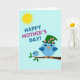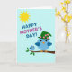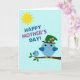 This card features two rounded blue birds sharing a tender, close moment, like a caring parent and a little one leaning toward each other ❤️. The larger bird sits on the right and wears a dark green hat topped with five pink flowers, each with a bright yellow center, adding a sweet touch of affection. To the left, the smaller bird perches on a dark brown branch with a few green leaves, angled toward the larger bird as if listening closely. The background is a pale blue, giving the scene a calm, springlike feel 🌼. In the upper left, a bright yellow sun with sharp, geometric rays spreads across the corner. The message “HAPPY MOTHER’S DAY!” runs diagonally across the upper area, with “HAPPY” and “DAY!” in deep blue and “MOTHER’S” in magenta for contrast. The branch stretches from left toward the center, with the leafy accents clustered near the birds.