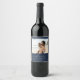 This wedding wine label features a joyful beach scene with two individuals, framed by a navy blue and white border that highlights the vibrant photograph. The design uses natural tones of blues, sandy beige, and earthy browns, complemented by a soft peach hue in the foreground. Elegant cursive typography spells "cheers," followed by customizable names and date in bold serif and simple sans-serif fonts, creating a structured yet intimate feel. Perfect for celebrating special moments, this label captures a candid, cheerful mood ideal for commemorating weddings or anniversaries.
