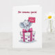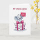 This card shows a soft grey, cartoon-style elephant with big ears and a short trunk popping up from a white gift box, smiling with eyes gently squinted as if sharing a sweet surprise with someone close ❤️. A large pink bow sits on top of the box, with a matching ribbon running down the front, giving the scene a dressed-up, romantic touch. Scattered purple heart shapes decorate the sides of the box, adding little hints of affection without crowding the design. The elephant holds up a magenta note card near the top right of the box, as if offering it forward like a friendly, caring gesture. On that magenta card, the words “With Love” appear in white, with small white hearts around the lettering 🌼. Above the illustration, the phrase “For someone special” is placed near the top in dark burgundy lettering, centered and easy to read. The background stays plain white so the character, bow, and hearts stand out clearly. A faint shadow sits directly under the gift box, making it look slightly lifted from the page.