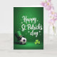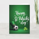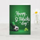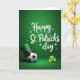 This greeting card features a deep emerald green background with a gentle gradient that gives the scene a little depth 💚. Across the upper area, the phrase “Happy St. Patrick’s day” appears in white, with small asterisks and dashes around it and a faint shadow that helps the letters stand out. In the lower left, a bright green leprechaun top hat sits at an angle, as if it was set down with a friendly wink after a laugh. The hat has a black band and a golden buckle, and it rests on a classic black-and-white soccer ball, suggesting a shared celebration between friends ☘️. On the lower right, a single three-leaf shamrock balances the layout, its soft shading making it look gently shaped rather than flat. Light falls softly across the objects, creating mild shadows underneath that keep everything grounded. The hat’s smooth green surface, the soccer ball’s crisp panels, and the shamrock’s subtle gradients are all clearly defined against the dark green field.