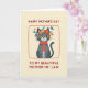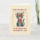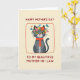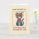 This card features a smiling gray cat with golden eyes and a small pink nose, giving a tender, friendly look that feels like a warm hug ❤️. A crown of flowers in pink, yellow, and deep red sits across its head, with leafy green sprigs tucked between the blooms. Small butterflies in blue, orange, and bright pink flutter around the crown, adding a light, affectionate energy to the scene. The cat wears a terracotta-striped neck accessory that brings a cozy, celebratory touch to its soft fur. A loosely drawn reddish-orange outline frames the character, like a casual sketch border that keeps the focus centered. The background is a smooth creamy ivory, leaving plenty of open space so the colors stand out clearly 🌼. Red uppercase lettering is placed above and below the illustration, with the top line arcing slightly and the bottom line sitting straight near the lower edge. The butterflies appear at different angles around the floral crown, with one hovering near the upper right side of the cat’s head.