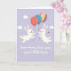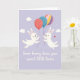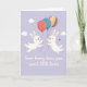 This design shows a soft lavender background that sets a gentle, dreamy sky, with two white bunny-like figures floating toward each other as if drawn together by friendship or romance 🐰. Their tiny dotted eyes and rosy cheeks face inward, giving them a tender, almost bashful look. Each one holds balloon strings, with the left figure carrying a red balloon covered in small white dots. The right figure grips two strings attached to a calm teal balloon and another balloon striped in pastel pink, yellow, orange, and purple 🐇. Small white clouds drift around them, and scattered little star shapes add sparkle to the open space. Near the right figure, a small red heart hovers like a quiet sign of affection between them. Along the lower portion of the card, a short message appears in white lettering centered against the purple background. The balloons show light shading and texture, with the striped one sitting just above the right bunny-like figure’s head.