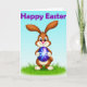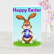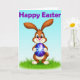 Designed with a springtime scene, the front features a friendly long-eared bunny in warm browns, with lighter touches on its belly and paw pads 🐰. Its wide eyes meet yours with a gentle smile, showing two front teeth and a small pink nose, like it’s sharing a sweet moment with a close friend. The bunny stands on fresh green grass with varied blades that add texture, set against a soft gradient sky-blue background. Held close in its paws is a decorated oval egg that seems to glow from within, blending deep blues and rich purples like a little secret between companions 🐇. A sharp white starburst shines from the egg’s center, with crisp rays stretching outward. Across the top, a seasonal greeting appears in large purple letters, centered and easy to read. Subtle shading and highlights give the bunny and the egg a rounded look, and the purple headline echoes the egg’s cool-toned colors. Behind the bunny, the sky fades from pale blue near the horizon to a deeper blue higher up, above the grassy strip.