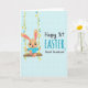 This card shows a light blue background with a faint grid texture, setting a calm spring scene. On the left, an upright long-eared bunny-like character 🐰 in warm fawn tones with soft pink accents sits on a simple wooden swing, wearing a bright turquoise top. Its big black eyes and gentle smile feel like a friendly invitation, as if it’s sharing the moment with someone just off the page. Small feet with pink pads hang down, adding a sweet, relaxed pose that suggests easy companionship. The swing is held by yellow ropes wrapped with green leaves and tiny blue and yellow flowers 🌷, like a little garland framing the character. On the right, the main festival word appears large in cerulean blue, with a smaller affectionate phrase beside it in a neat black handwritten-style font. The blue headline sits above and slightly left of the black wording, creating a balanced layout across the open space. The yellow ropes arc down toward the swing seat, with blossoms clustered near the top where the greenery gathers.