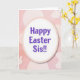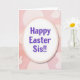 This card features a large white oval at the center, drawing your eye in like a quiet spotlight. Inside the oval, a seasonal greeting addressed to a loved family member appears in violet lettering, centered and easy to read. The rounded letter shapes feel friendly, like a warm note shared between close relatives, with the purple color adding a gentle romantic touch. Around the oval, the background fades through soft blush pink tones, creating a calm spring setting 🌷. Faint lighter shapes drift across the pink field, including a few that resemble bunny ears and soft leaf-like forms 🐰. The pale patterning stays subtle so the message remains the main focus, while still hinting at an Easter theme. The overall layout is simple and balanced, with the text sitting neatly within the bright oval against the rosy gradient backdrop. Along the outer area, the barely-there ear shapes and organic silhouettes repeat in a lighter pink, framing the center like a soft border.