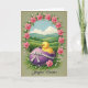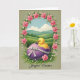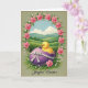 This greeting card features an oval scene of rolling green hills under a soft blue sky with small white clouds, like an early spring morning. In the center, a fluffy yellow chick peeks out of a rich purple eggshell, and the shell is wrapped with a white ribbon tied into a tidy bow. The chick’s orange beak and dark, curious eyes face forward, giving it a gentle, friendly look that feels like it’s reaching out to someone special. Around the oval, a ring of pink four-petaled flowers with tiny pale centers mixes with green leaves and small white berry-like buds, creating a garden-frame effect 🌷. The background is a muted sage green that lets the yellow, purple, and pink details stand out without looking loud. Along the bottom edge, the words “Joyful Easter” sit centered in a flowing, dark ink style that contrasts clearly against the lighter background 🐇. The edges of the artwork look slightly worn, like a softly aged print with faint, weathered borders.