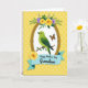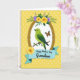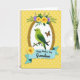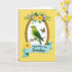This card features a luminous green bird perched on a slim brown branch, its head tilted as if sharing a quiet, friendly moment ❤️. The bird sits inside a textured golden oval frame with a bright white center that makes the scene feel airy. To the right of the frame, an orange-and-black butterfly hovers close by, adding a gentle sense of connection in the small space between them. Above the frame, yellow roses bloom alongside soft lavender flowers and deep green leaves, draping slightly over the top edge like a tender embrace. The background is sunlit yellow with lighter yellow polka dots scattered evenly across it, giving the whole layout a soft spring feel 🌼. Near the bottom, a light blue banner stretches across for the message, with the text centered on the ribbon in a darker contrasting color. A single yellow rose rests beside the banner, echoing the flowers above and balancing the composition. The golden frame has a subtle metallic sheen, and the white inner area stays crisp against the dotted yellow backdrop.