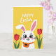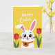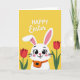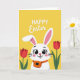 This design shows a tall, sunny spring scene with a white bunny centered on a smooth yellow background 🐰. The bunny has big black eyes, rosy cheeks, and a small open smile with two front teeth, giving it a sweet, friendly look. Long white ears with soft pink inner details frame its face, adding a gentle, affectionate touch. An orange satchel hangs at its chest on a thin strap, suggesting it’s out on a cheerful seasonal errand. On both sides, two red tulip-shaped flowers rise with green stems and leaves, like they’re leaning in to keep the bunny company 🌷. At the top, the words “HAPPY Easter” appear in white, with “HAPPY” above and “Easter” just below it, both set clearly against the yellow. The flowers sit evenly to the left and right of the bunny, their red petals standing out sharply against the bright yellow field.