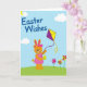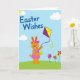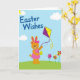 Designed with a sweet spring scene, this card shows a friendly long-eared character in soft orange standing under a wide blue sky 🐰. The character wears a bright pink frock with a matching bow, smiling with rosy cheeks and a gentle, inviting gaze that feels like it’s meant for someone special. In one hand, it holds the string of a purple-and-yellow diamond-shaped kite, with curly ribbons streaming behind it as if dancing in the breeze 🐇. In the other hand sits an oval egg decorated with yellow-and-green stripes, tucked close like a small gift. Across the upper area, a short greeting appears in rounded blue lettering, centered and easy to spot against the sky. In the top-left corner, a golden crescent moon peeks from behind a pale cloud, adding a dreamy touch above the scene. Along the bottom, a curved green hill sweeps across, and on the right side three pinwheel-like flowers in fuchsia, orange, and red rise from the grass 🌷.