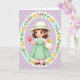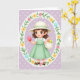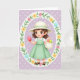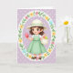 This card features a young girl in an animated look, standing at the center with a gentle, friendly smile that feels like she’s sharing a secret find with you. She’s framed inside an ornate oval wreath filled with soft yellow and sky-blue flowers, leafy green sprigs, and small pink bow accents, giving the scene a sweet springtime feel 🌷. Behind her, the background is lavender with tiny white polka dots that add a light, airy texture. She wears a wide-brimmed cream hat with a mint-green ribbon and a pastel green dress layered over a white collared shirt, and her short brown hair sits tousled around big brown eyes and rosy cheeks. In her raised hand, she holds a glossy pink egg-shaped oval as if offering it to a close friend, while her other hand carries a cream basket with a red and a green oval tucked inside 🐰. The main greeting text sits near the top in a soft pastel tone, with smaller supporting words placed below in a lighter shade so the illustration stays in focus. The oval border is detailed with looping floral shapes, and the pink bows repeat around the wreath like little tied ribbons. The basket rests near her hip, shaded in cream with a curved handle and the three colorful ovals clearly visible against the lavender dotted background.