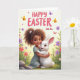 This greeting card shows a sweet scene of a young child with dark, curly hair sprinkled with small white daisies, cuddling a fluffy white bunny 🐰 close to their cheek. The child’s wide brown eyes and bright grin meet the bunny’s gentle gaze, and the bunny’s softly pink-tinted cheeks make the moment feel like a quiet hug between close friends. Around them, pink and purple blossoms cluster like a garden frame, with fresh green leaves filling the lower edges. Warm, diffused light spreads across the artwork, giving the figures smooth, rounded shading and a cozy springtime glow. Near the top, small butterflies in yellow-gold and purple flutter beside tiny red hearts, adding a light touch of romance to the air 🌷. The greeting “HAPPY EASTER Little One” sits above the characters in large, bubble-like pink letters, centered and easy to read. Pink and purple flowers rise on both sides of the child and bunny, while the hearts and butterflies float just under the upper border. Share Easter sentiments with someone you love.