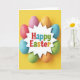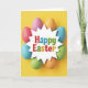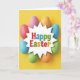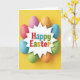 This design shows a bright yellow background with a white starburst shape in the center, edged with jagged points like a friendly burst of energy. Inside the starburst, a festive Easter greeting sits in rounded letters, each word in a different pastel color, making it the main focus. Around it, seven smooth egg-like ovals form a neat circle, arranged like petals in a flower, leaning toward one another as if in a cozy ring of friendship 🐰. The ovals are softly shaded with gentle highlights, giving them a 3D look against the flat white center piece. Colors include light rose, warm coral, sky blue, lime green, and apricot tones, spaced evenly so the circle feels balanced and welcoming 🌷. The text is centered within the starburst, with the multicolored lettering standing out crisply against the white shape. Subtle shadows fall beneath each oval on the yellow field, and the matte surfaces look softly lit from above.