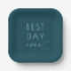 This wedding plate features a modern and sophisticated design with a deep teal background, creating a striking contrast against the white text. The layout is minimalist, showcasing the phrase "BEST DAY ever" in a combination of clean sans-serif and elegant script fonts, evoking a celebratory and optimistic mood. Perfect for marking memorable occasions, this plate combines boldness with elegance, making it an ideal choice for weddings or special events.