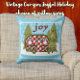 A sweet vintage camper trailer sits on a white snow covered slope . The festive camper is red and white checked. A holiday wreath is pinned to the door. The two windows are adorned with red curtains and green and white awnings. Each window has a flower box filled with Poinsettias and holly. Green pine trees surround the camper, one of which is decorated with strings of light and colorful holiday ornaments. A red star sits atop the decorated tree. The background Is a light blue sky filled with snowflakes. Add some extra Merry to your holiday season with this especially cute festive throw pillow. It's available in different sizes and materials.