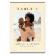 This wedding table card features a central photo placeholder of two individuals on a beach, framed by a soft beige background. The design includes bold serif typography for "TABLE 2" at the top and elegant script font for customizable names below the image, creating a personal touch. Warm tones dominate the palette, with peach and white clothing contrasting against the sandy backdrop, evoking a joyful and inviting mood perfect for celebratory occasions. The clean lines and smooth gradients give it a contemporary yet timeless feel, ideal for adding both aesthetic charm and clear communication to your event.