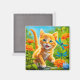 A cute orange tabby kitten frolicking in a flower garden with colorful dragonflies.