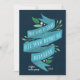 Elegant flat holiday cards for your business feature "may love and light fill your heart at Hanukkah" in hand lettered typography on a blue watercolor ribbon accented with green leaves and white berries. Personalize with your name or company name and the year in white on a navy blue background, and add a custom message to the back, along with your business logo.