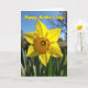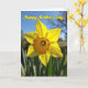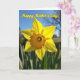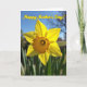 This card features a single sunny flower, similar to a daffodil, centered like a little love note from nature ❤️. Its bright yellow petals open wide in the light, with gentle shadows that make the surface look soft and touchable. The middle forms a ruffled, cup-like center in warm golden orange, adding a cozy glow that feels like a caring embrace. Behind it, a calm blue sky fades into a soft blur, giving the bloom all the attention like it’s being admired by someone special. Near the bottom edge, a few green leaves peek in, grounding the scene the way a steady friend quietly supports you. Across the top, the message “Happy Mother’s Day!” sits in yellow lettering with an orange outline, standing out clearly against the sky 🌼. In the distance, faint bare branches are lightly visible, thin and gray against the blue background.