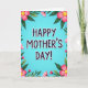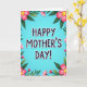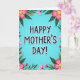 This greeting card features a large “HAPPY MOTHER’S DAY!” message centered in rounded dark blue letters with a thin white outline, standing out clearly against the background. Around the words, a curling floral frame wraps in from the edges, like a gentle hug that suggests closeness and care ❤️. Pink flowers with softly shaded petals and bright yellow centers sit near the corners, and their curved stems guide your eyes back toward the greeting. Green leaves tuck between the blossoms, adding a fresh, garden-like feel that leans into a sweet, friendly mood. The background is a sky-blue gradient that shifts from paler near the middle to deeper toward the edges, like daylight spreading across a spring morning 🌼. The text sits slightly above the centerline with generous spacing, leaving room for the floral border to breathe without crowding the lettering. Subtle highlights and shadows on the petals and leaves give the illustration a gentle depth, making the blooms look plump and soft. The corners each hold a cluster of pink blossoms and green leaves that curve inward around the central message.