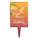 A juicy bright ombre background of gold to magenta highlights a floral stem reaching across this trendy and modern bridal shower cake pick. A watermark of the flower appears at the bottom framing customizable text. A beautiful look to top off an elegant bridal shower. Available in alternate colors with matching products.
