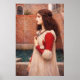 “Juliet” by John William Waterhouse captures a quiet, poignant moment of waiting beside the water, where a young woman stands in profile against warm brick walls and distant windows. Her dark hair spills in soft waves beneath a thin golden band, and she presses a strand of black beads to her chest as if holding onto a promise. The contrast of rich red sleeves and a pale, flowing gown draws the eye to her stillness and composure, while the muted canal and sun softened architecture create a hushed, enclosed world around her. With delicate skin tones, gentle highlights, and a dreamy atmosphere, the painting turns a simple pose into a story of longing, tenderness, and restrained emotion.