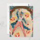 Illustration from an antique postcard. Uncle Sam in a colorful stars and stripes outfit strides across the card tossing firecrackers. Message reads, Hurrah, Hurrah, for the Fourth of July.