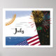 July Art Deco Beach Scene with Flag and Fireworks Poster
