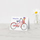 A fun red, white and blue bicycle with an adorable golden puppy in the basket!