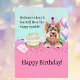 This delightful Australian Terrier has hopped up onto the birthday party table, joining the fun next to balloons, a cookie dough vanilla cake, and cups of soda.