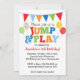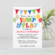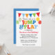 Our colorful Jump & Play Balloons invitation in primary colors features colorful letters, patterns and balloons and makes a perfect invitation for any child's party with a bounce house, trampoline or jump and play theme.