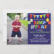Our colorful Jump & Play Balloons photo style invitation in navy blue and bright primary colors features colorful letters, patterns and balloons and makes a perfect invitation for any child's party with a bounce house, trampoline or jump and play theme.