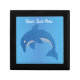 This wood gift box for trinkets, jewelry, or gift giving has a cute dolphin in a jumping position who is a glittery deep blue with white stomach on a water like blue background.
