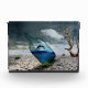 Jumping killer whale in bottle on dry cracking desert photo.