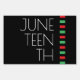 A Juneteenth celebration yard sign. The sign is red, black, and green with the background in black with white letters.