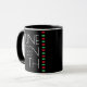 A Juneteenth celebration coffee mug. It has a design including a black background, a red, black, and green stripe, and the letters are in white.