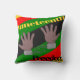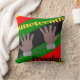 This throw pillow has a Juneteenth design of hands in broken chains with a background of red, yellow, green, and black lines.