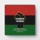 Stylish CHRISTIAN JUNETEENTH Desktop Plaque with motivational message saying CELEBRATE FREEDOM, followed by the Scripture NO LONGER SUBJECT TO THE YOKE OF SLAVERY, which is based on the Bible verse from Galatians 5:1, which says 'Christ has set us free in freedom; stand fast therefore, and be not held again in a yoke of slavery. The design shows a black power fist with yellow outline, set against the pan African colors of red, black and green, with white typography. All text is CUSTOMIZABLE, so you are able to replace and/or delete as desired. Other items are available in the BLACK HISTORY MONTH Collection by Berean Designs.