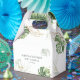 Wild forest themed giraffe, and elegant boys safari animal baby shower favor box featuring a giraffe, an elephant, gold foil and green leaves.