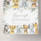 Invite friends and family in style and set the tone for your special day with this charming baby shower invitation. Design features jungle animals (giraffe, zebra, lion, elephant, cheetah, rhino) and eucalyptus leaves on white background.