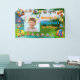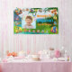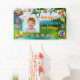 Welcome to a prehistoric party with this vibrant Jungle Baby Dino Kids Birthday Party Banner! Centered prominently is a joyful photo of the birthday child, framed by a colorful jungle scene filled with adorable baby dinosaurs. Friendly faces like a playful T-Rex, a curious Triceratops, and a gentle Brontosaurus peek out from behind lush green leaves and vibrant tropical flowers, creating an inviting atmosphere.
