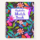 Sketch Book Jungle Flowers is a cute, bright, whimsy jungle flower design with pretty colors, flowers, leaves, and botanicals of all shapes and sizes with pops of color on dark background with purple text and outline.